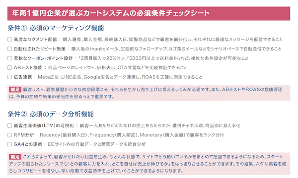 チェックシートでは「5つの必須条件」など、年商1億円超えを達成するためのカート選びについて3Pの資料でまとめています。